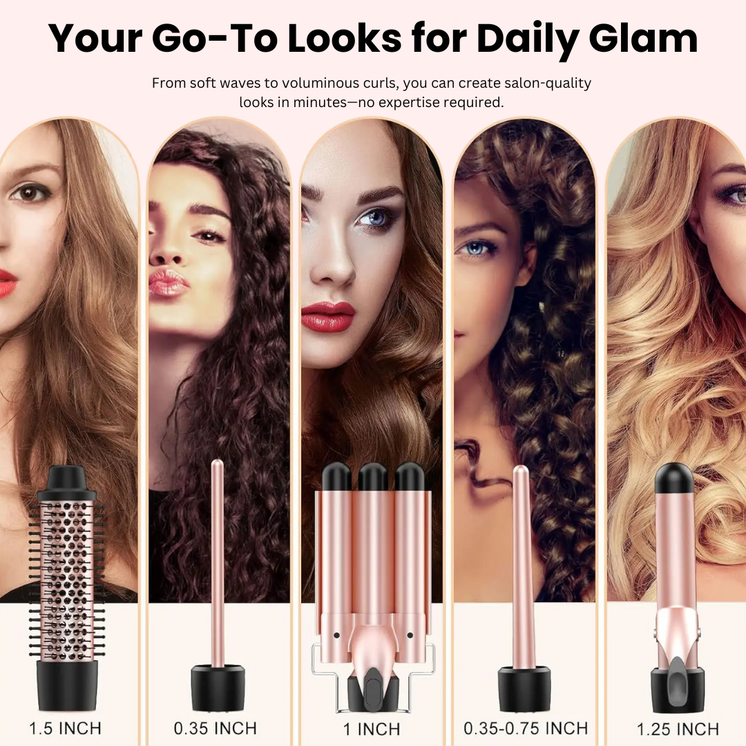 The ProWave Set features five interchangeable wands, advanced heating technology, and a frizz-free ceramic coating, allowing you to create multiple styles with just one tool.